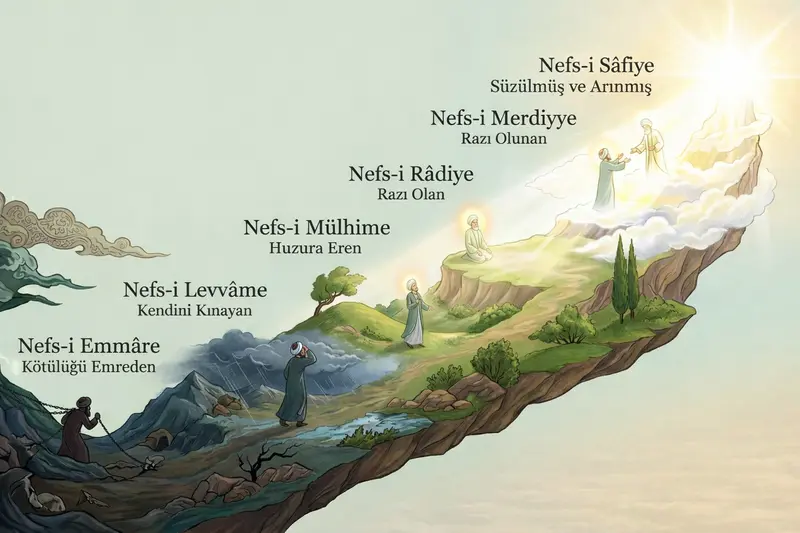 Tasavvufta nefis mertebeleri (Etvâr-ı Seb’a) nedir? Nefs-i Emmâre’den Nefs-i Sâfiye’ye uzanan yedi aşamalı manevi terbiye sürecini inceleyin.