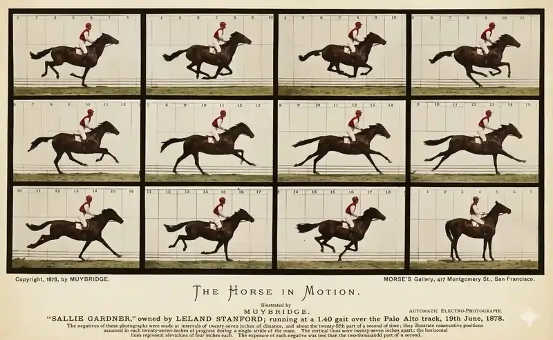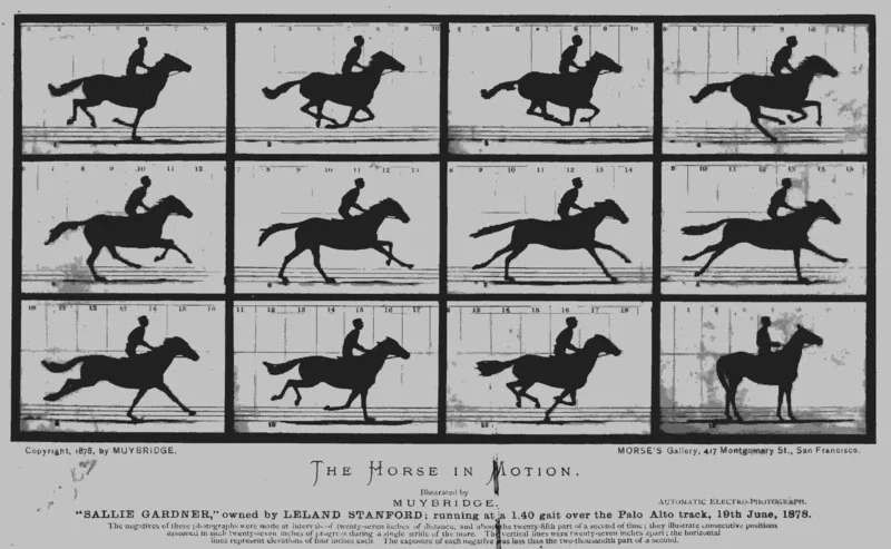 Eadweard Muybridge, bir atın dört ayağının birden havada olup olmadığını kanıtlamak için yan yana dizili 12 kamerayla çekim gerçekleştirdi. Atın tellere çarparak tetiklediği bu kareler, hareketin parçalara bölünebileceğini göstererek sinemanın temelini attı.